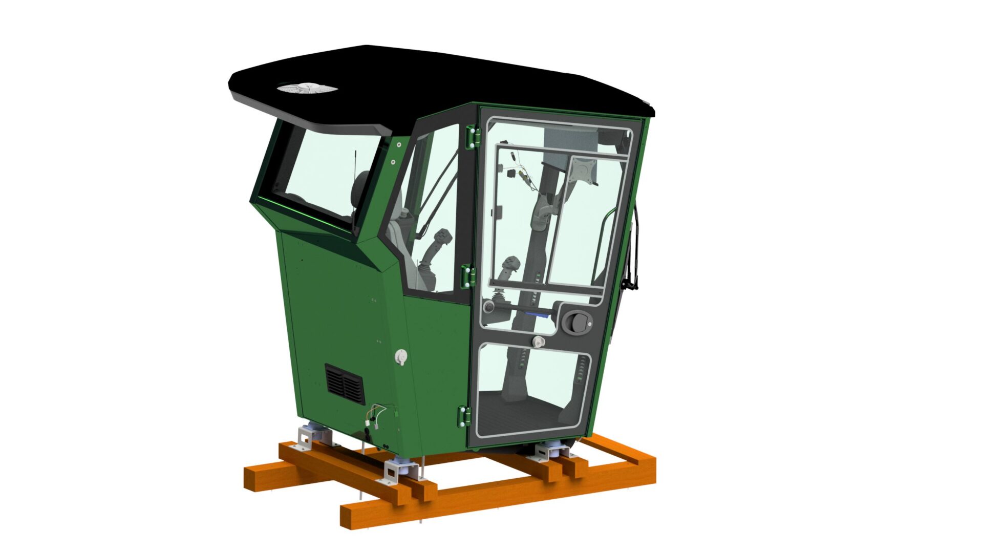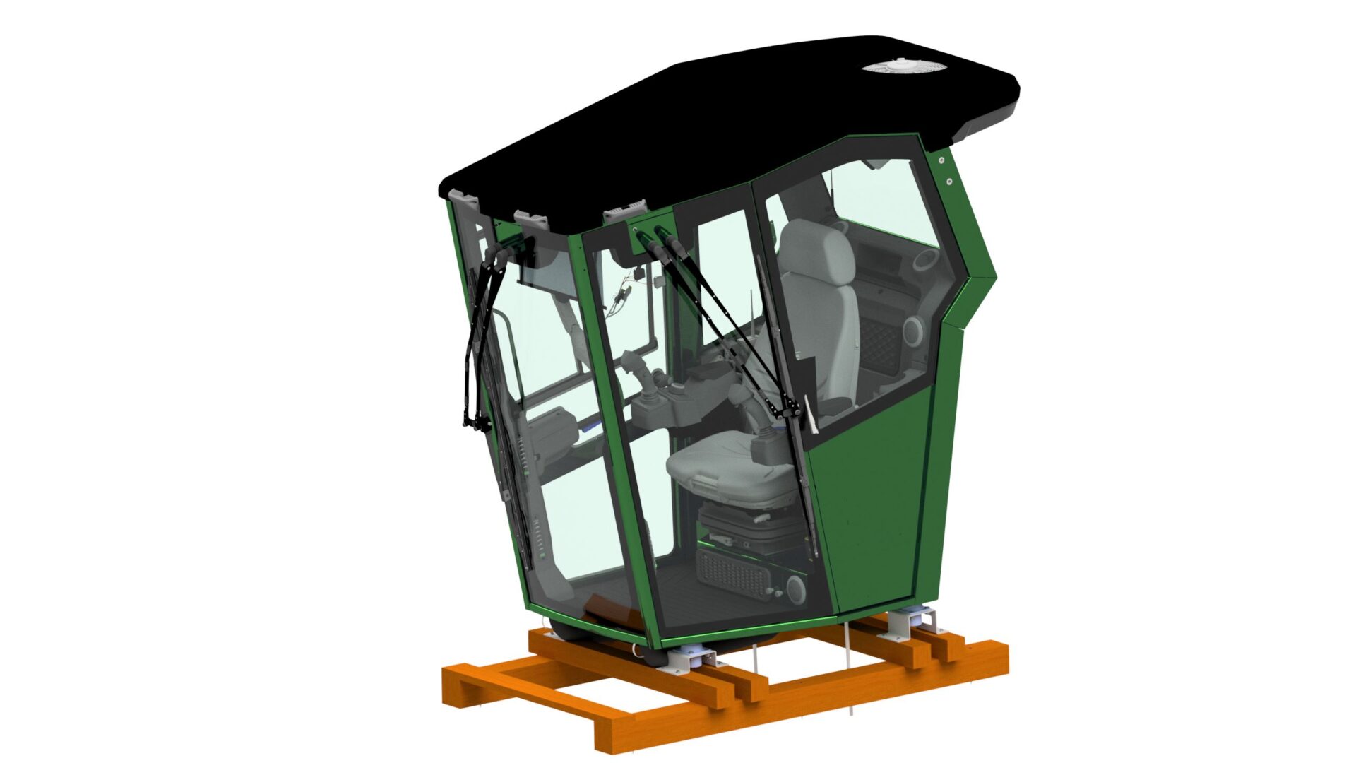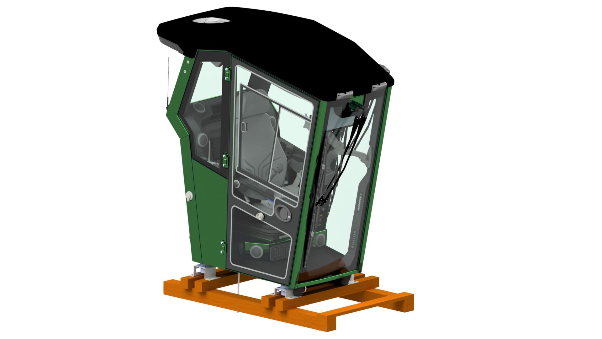 Kabinen kan bestilles i producentens farve. Som standard er kabinen udstyret med aircondition, varmeapparat incl. kontrolpanel, Grammer MSG 95/732 luftsæde med høj ryg, armlæn forberedt til joysticks, holder til skærme, solafskærming i frontruden, store vinduesviskere med vaske-system og isolering mod kulde/støj på de indvendige metal-flader, udvendig og indvendig plastik afdækning, 3 udvendige LED lygter, indvendigt LED lys, dørholder med fjernbetjening og bluetooth/DAB radio med højtalere og antenne. Der kræves en AC pumpe på maskinen samt tilslutning til motorens kølesystem, for at forsyne aircondition/varmeapparatet. Kabinen sendes på en engangs-træpalle. Kan formonteres med kunde-ledningsnet.